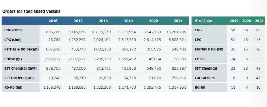 同時,去年除郵輪外的特種船市場表現(xiàn)十分活躍。2021年LNG船新船訂單量達到98艘1520萬立方米,其中12艘為LNG加注船。LPG船訂單量也達到了創(chuàng)紀錄的135艘。不銹鋼化學品船和汽車運輸訂單量均高于前幾年,而郵輪訂單幾乎消失。