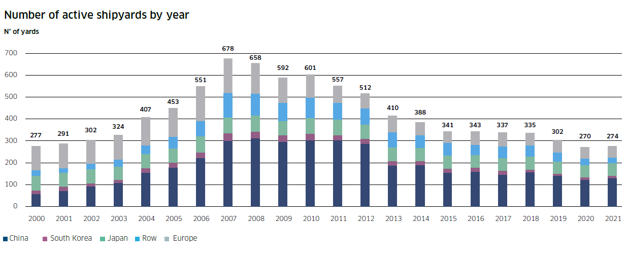 目前,全球活躍船廠(年內(nèi)接獲新訂單和/或交付新船的船廠)數(shù)量為274家,比2020年增加了4家,但僅為2007年最高約700家的40%左右。截止2021年底,全球手持訂單量從2020年底的1.8億載重噸(2003年以來最低數(shù)字)增至2.23億載重噸。