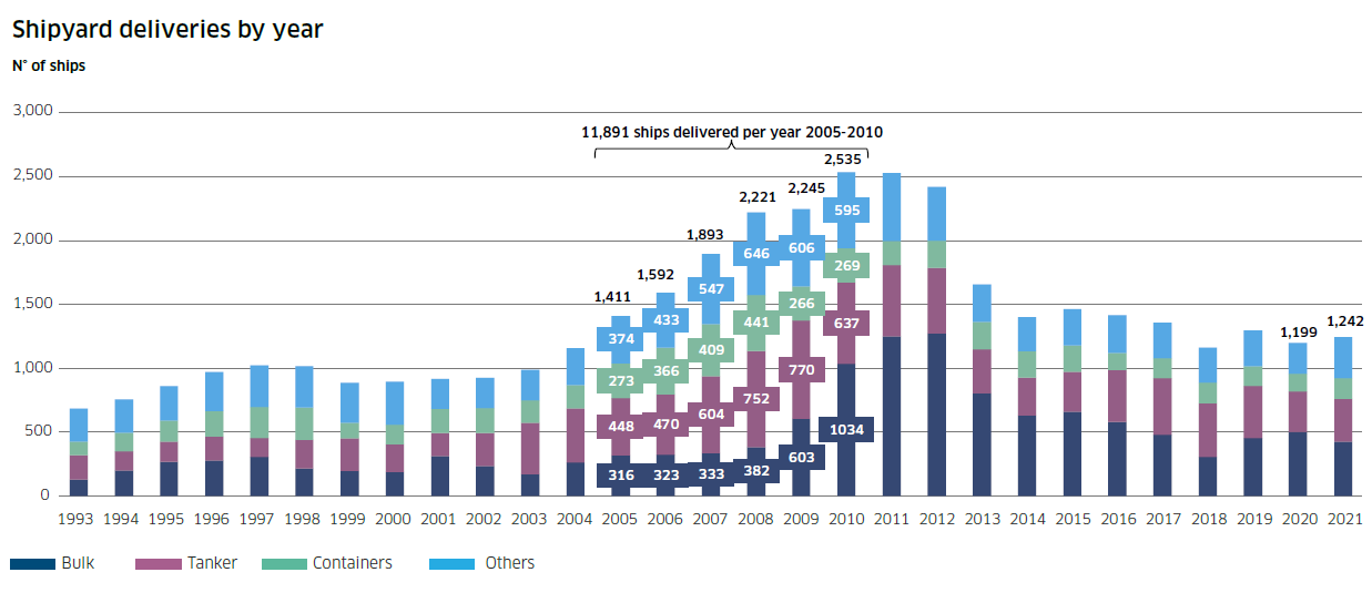 首先,全球造船廠數(shù)量已經(jīng)從2007年的約700家將至目前約300家,在此過程中全球造船產(chǎn)能收縮,目前全球每年能夠建造和交付約1200-1300艘船,遠低于2005-2010年間平均約2000艘的產(chǎn)能水平。