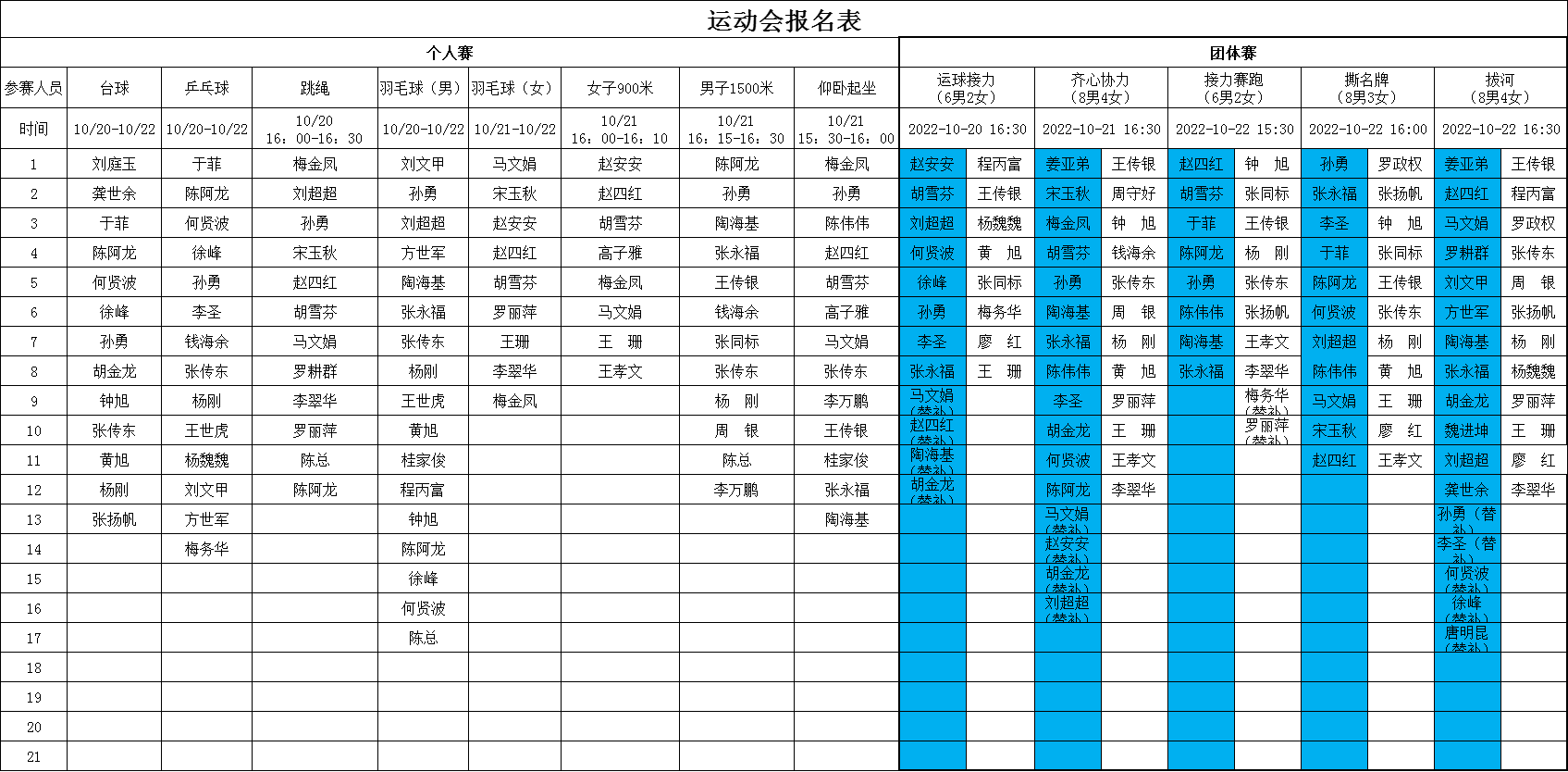 金秋送爽、丹桂飄香,在這秋高氣爽的美好時(shí)節(jié),我們滿懷喜悅的心情迎來了公司2022年度秋季職工運(yùn)動會。本屆運(yùn)動會分個(gè)人賽、團(tuán)體賽,自10月20日至22日共持續(xù)3個(gè)下午,比賽項(xiàng)目包括乒乓球、羽毛器(男子、女子單項(xiàng))、臺球、跳繩、仰臥起坐、女子900米,男子1500米長跑8項(xiàng)個(gè)人賽,還有齊心協(xié)力、運(yùn)球接力、女子接力賽、男子接力賽、撕名牌、拔河共6項(xiàng)團(tuán)體賽。在歷屆運(yùn)動會的賽程、賽項(xiàng)上都增加了新的活動亮點(diǎn),從參賽名單上不難看出,全體協(xié)普家人的熱情和參與度都異常高漲。