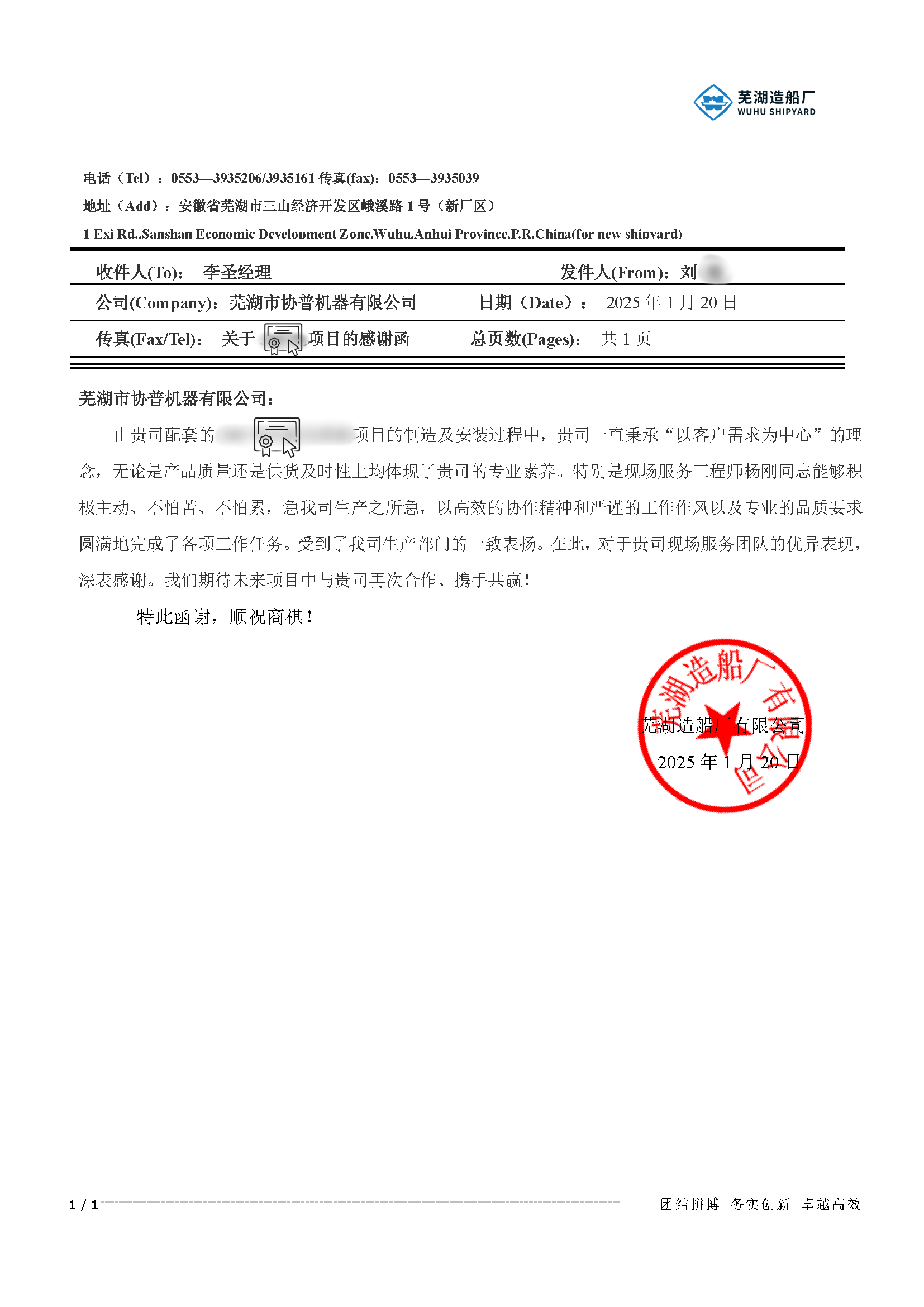2025年,協(xié)普在給蕪湖船廠配套項目的制造及安裝過程中,一直秉承“以客戶需求為中心”的理念,無論是產品質量、還是供貨及時性以及現(xiàn)場的服務均受到了蕪湖造船廠的高度認可。協(xié)普團隊,以高效的協(xié)作精神和嚴謹的工作作風以及專業(yè)的品質要求圓滿地完成了各項工作任務。受到了蕪湖造船廠生產部門的一致表揚。